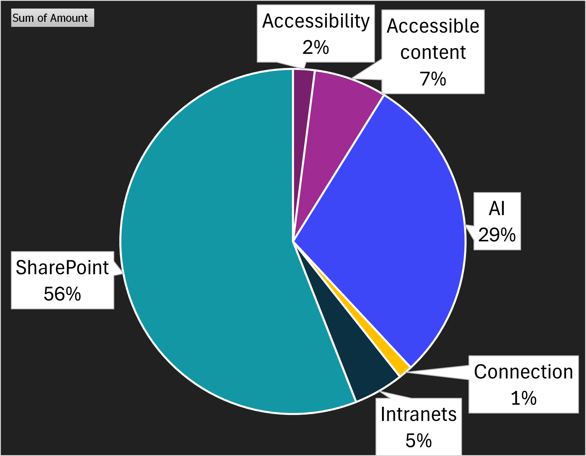 29% is much higher than last year’s 8.6% working on AI related projects, and probably higher than I’d realised before looking at the statistics, too. Accessible content design and training is something that has also been ticking along, although so far have been much smaller projects – some of that is carrying over into FY25/26, and a lot of it involves *stage whisper* PowerPoint!