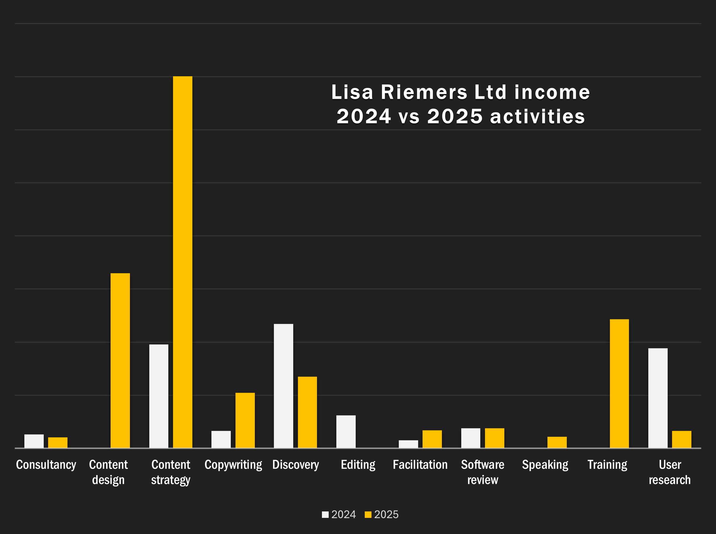 The (mainly taller) yellow bar in the graph shows this year’s gross income vs last year’s white bar. Content strategy and design have been my biggest areas of work, with training, discoveries and copywriting coming in behind. It doesn’t take into account that some of this has gone straight out again to associates, and my costs have been higher as I’ve invested in training too, but it’s overall a much healthier place to be in for me, after a series of quieter years. I’ve continued reviewing intranet software, including my independent work for the Clearbox reports . I love speaking, and paid opportunities have started to come my way.