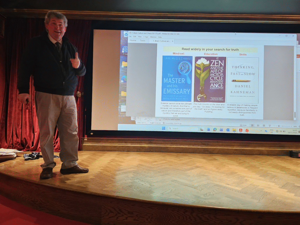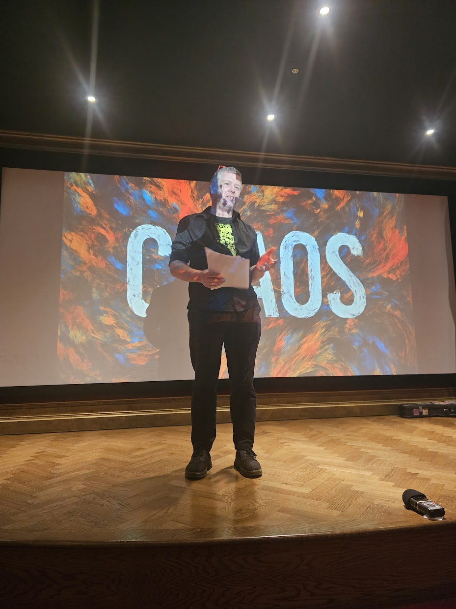 We made our way up to the beautifully appointed cinema, helped ourselves to popcorn, and settled in to hear from 4 speakers about chaos, after a glorious introduction from Eoin.