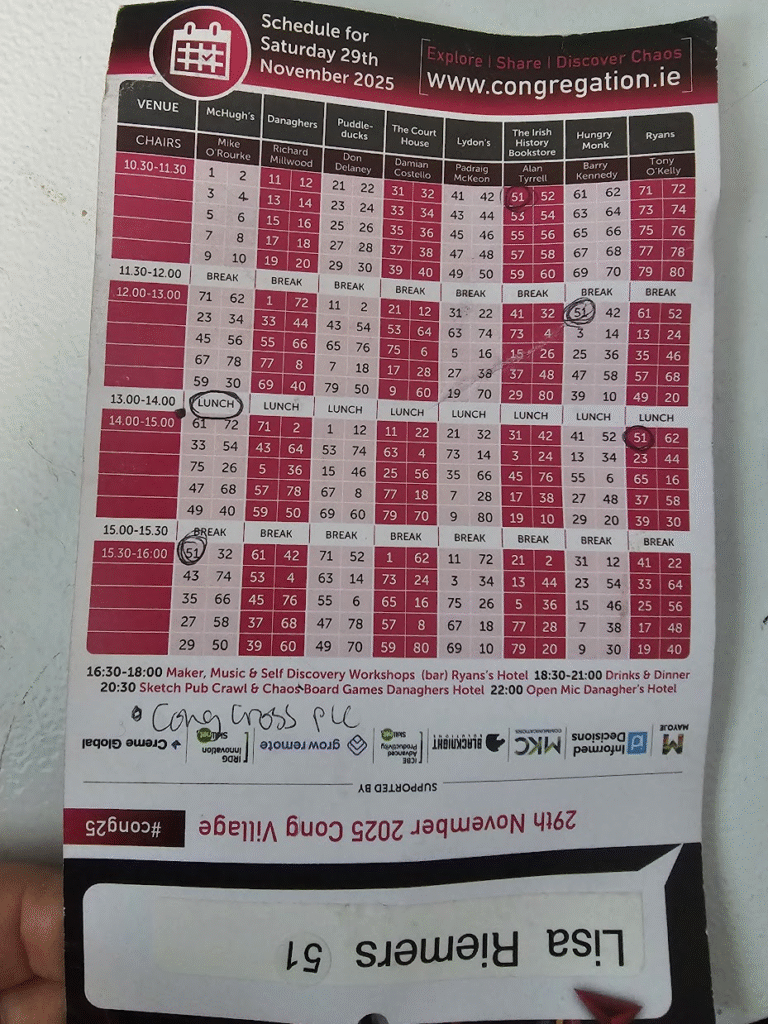 Cong is a remarkable destination. The event has a remarkable feeling to it. The perfect blend of facilitation and serendipity to make some really wonderful connections. What an absolute treat to be able to spend the weekend hanging out with the sort of folks who want to spend the weekend hanging out with people and chatting. Ostensibly around a topic, which this year was chaos, but I suspect many would be equally happy talking about order.
